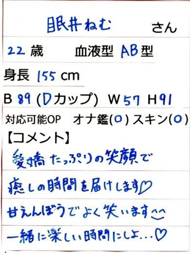 当店の眠井ねむさんは黒髪で素人らしい初々しさが魅力の女の子です。ほんのりアニメっぽい可愛い声と自然な笑顔がチャームポイントで、話しているとこちらまでつい笑顔になってしまいます。性格は明るくて天然、ちょっと甘えん坊なマイペースさんで、しかも聞き上手。彼女と一緒にいると、自然と心がほぐれて時間を忘れてしまうような、そんな癒しのひとときをお届けします。